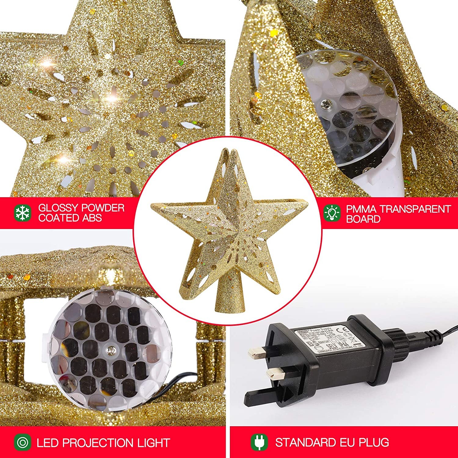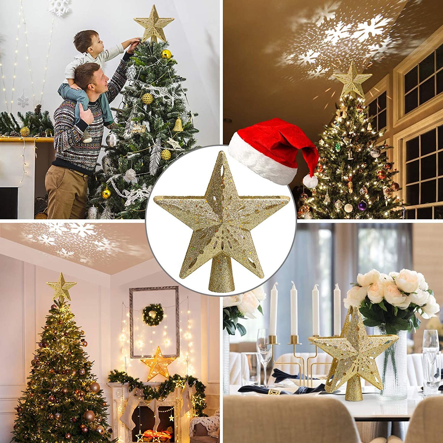 • 【AMAZING CHRISTMAS TREE TOPPER PROJECTOR LIGHT】Our Snowflake Christmas tree topper has unique hollow-out design and golden shining powder which covers the entire surface of our Christmas tree top. It must be the perfect finishing touch on your Christmas decoration. The Christmas tree topper could create incomparable Christmas atmosphere. Moreover, Magic projector will bring warm, sweet and happiness throughout your house if you light on Christmas tree topper.