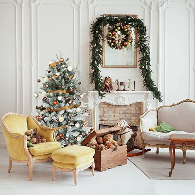 Kinder King 5FT Snow Flocked Artificial Christmas Tree, Premium Spruce Hinged Holiday Tree for Home, Office Decoration, 506Tips, Ornament Balls Included, Easy to Assemble, Foldable Metal Stand