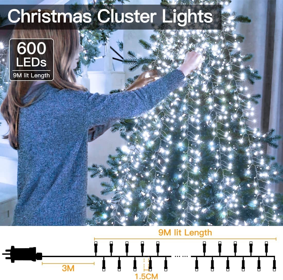 Ollny Christmas Cluster Tree Lights - Outdoor Christmas Decorations 9M 600 LED Waterproof Fairy String Light Plug in with Memory Timer Remote 8 Lighting Mode for Outside Garden Window