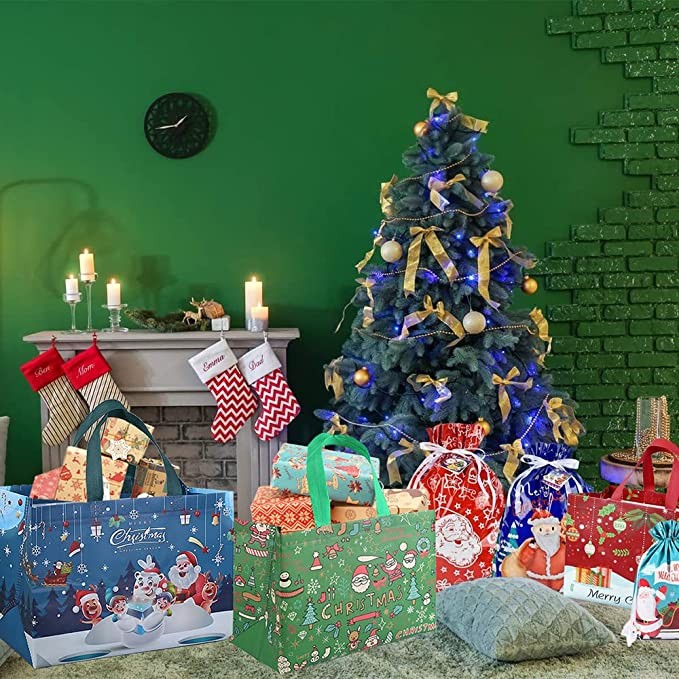 DOJoykey 12pcs Large Christmas Tote Bags with Handle, Reusable Christmas Gift Bags Shopping Bag Wrapping Bag Xmas Holiday Party Decoration