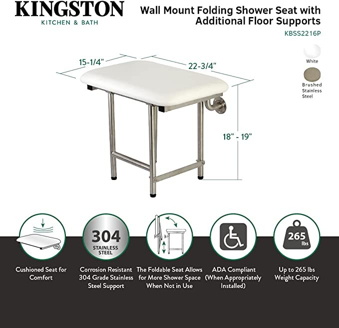 Kingston Brass KBSS2216P Adascape 55.88cm x 40.64cm Pathology Wall Mounted Folding Shower Seat w/Extra Floor Support Brushed Stainless Steel