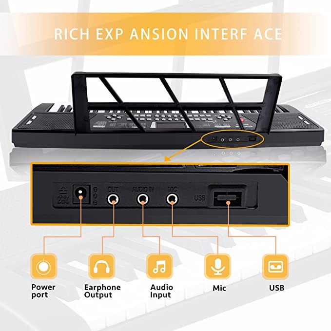 SEIF-PLAY AND SINGING: The piano keyboard has built-in dual speakers, the clear sound quality helps to find the rhythm of music creation, supports the microphone input function, (the two ends of the box are microphone and power) let you record songs while playing, experience the self- play and sing. The key is designed with rebound force feedback, the touch is realistic, and the key strength is moderate, which is suitable for beginners to practice for a long time.